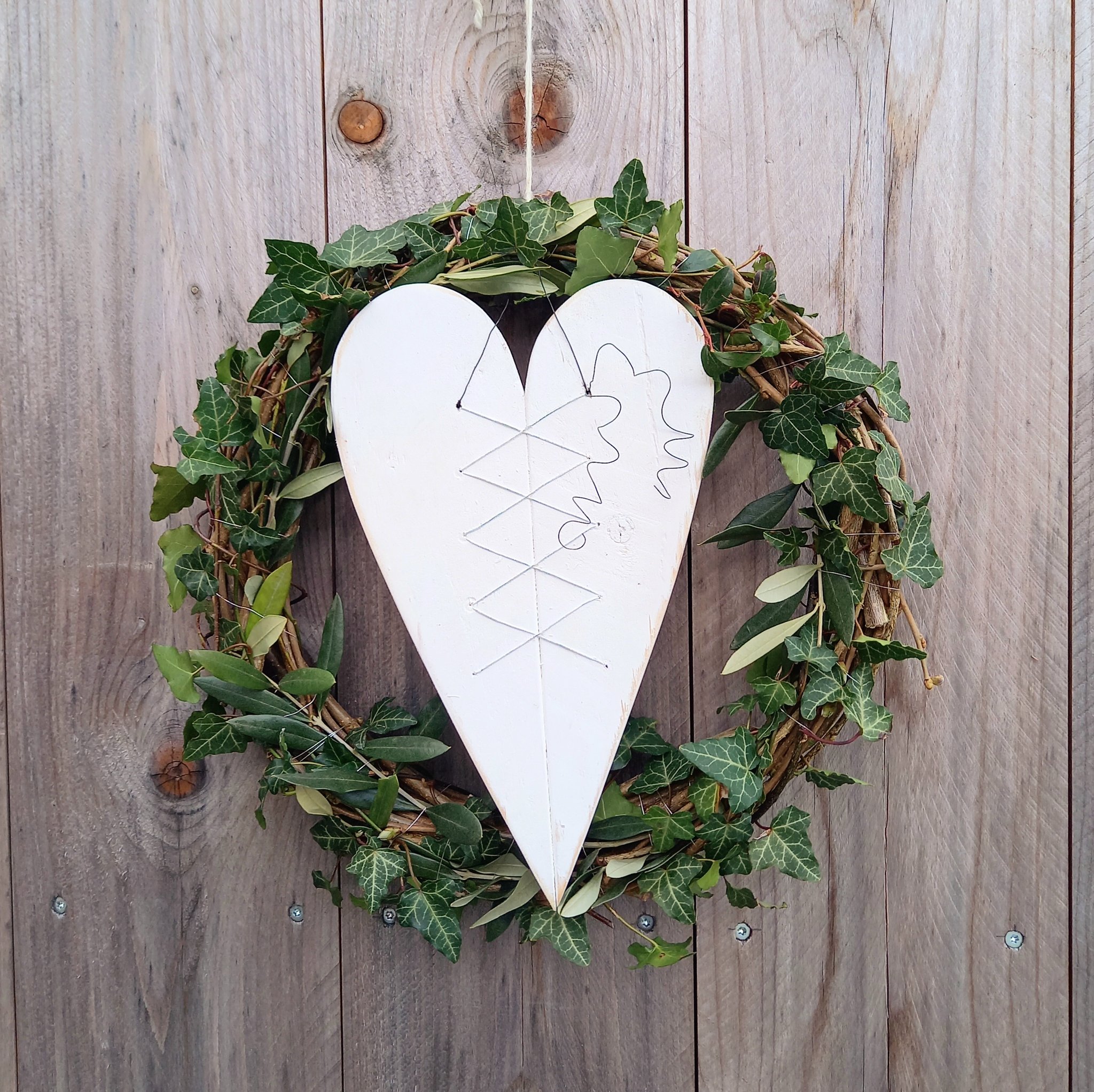 Für diese Dekoration benötigst du etwas Geduld. Du bereitest erst den Kranz vor, danach bauen wir ein Herz aus Holz, mit dem der Kranz geschmückt wird.